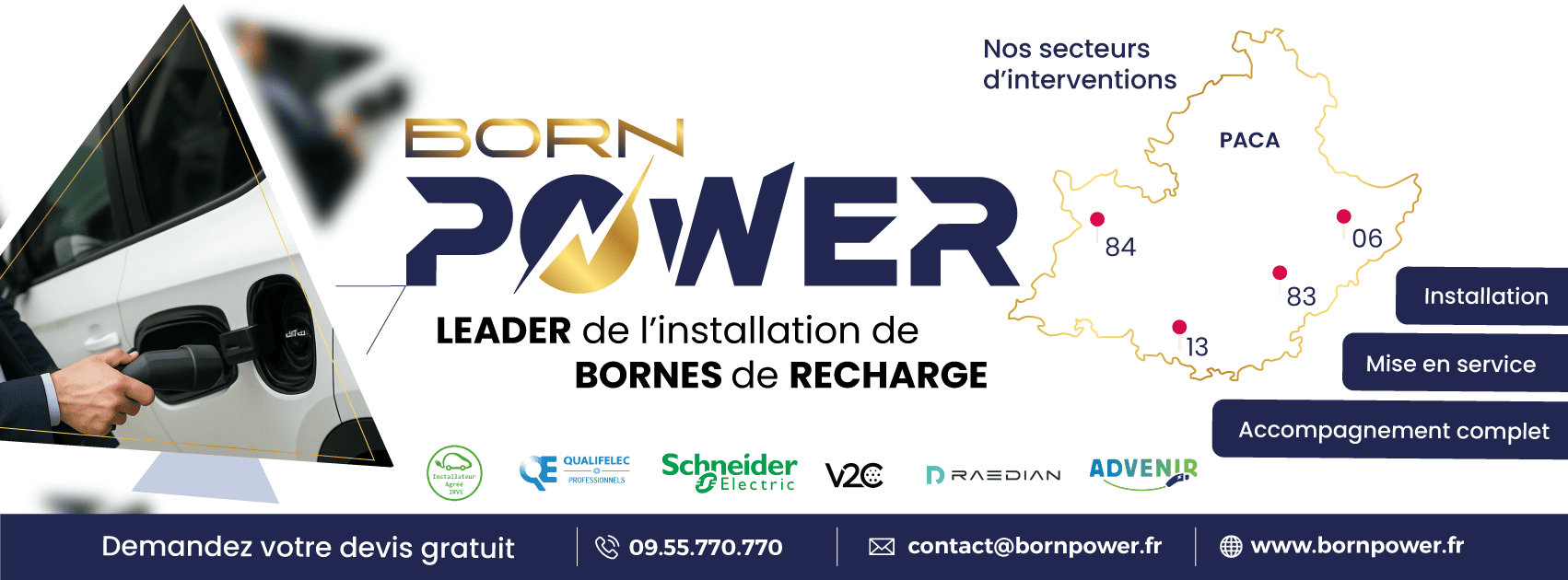 Born Power accompagne les particuliers, entreprises, copropriétés et hôtels dans l’installation de bornes de recharge pour véhicules électriques, avec des solutions personnalisées et clé en main. Certifiée IRVE, notre société garantit des installations fiables, sécurisées et conformes aux normes, couvertes par une garantie décennale. Profitez des aides financières de l’État (prime Advenir + crédit d’impôt) pour réduire le coût de votre installation. Nous intervenons dans tout le sud-est de la France : Marseille, Aix-en-Provence, Toulon, Nice, et leurs environs. Avec une expertise reconnue dans les bornes électriques, Born Power est votre partenaire de confiance pour passer à la mobilité durable.